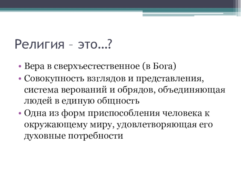 Религия – это…?Вера в сверхъестественное (в Бога)Совокупность взглядов и представления, система верований и обрядов, объединяющая людей в единую общностьОдна из форм приспособления человека к окружающему миру, удовлетворяющая его духовные потребности