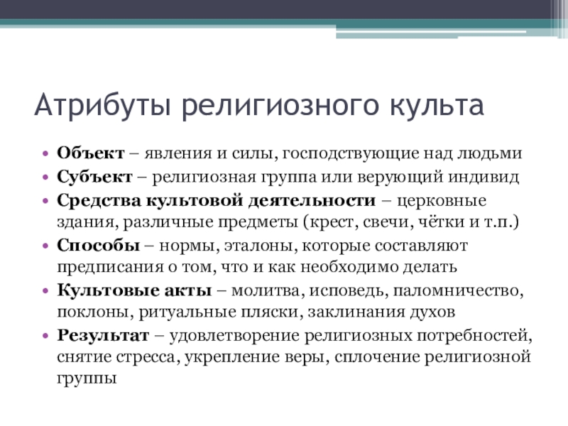 Атрибуты религиозного культаОбъект – явления и силы, господствующие над людьмиСубъект – религиозная группа или верующий индивидСредства культовой