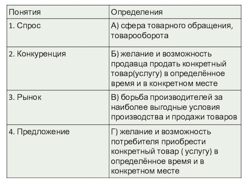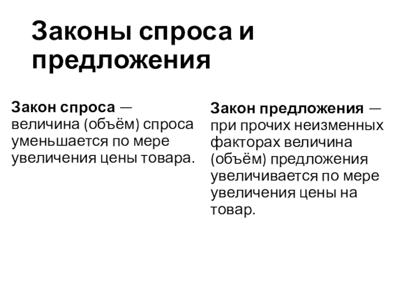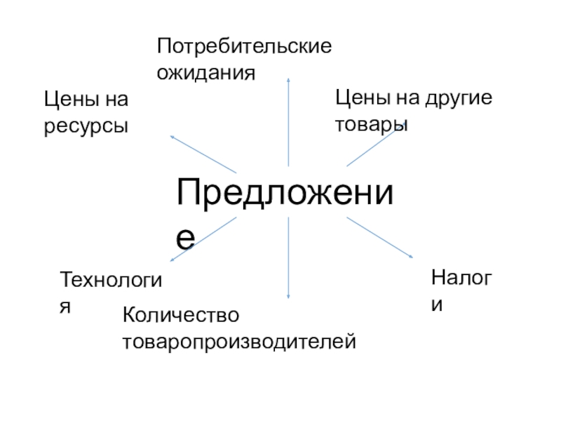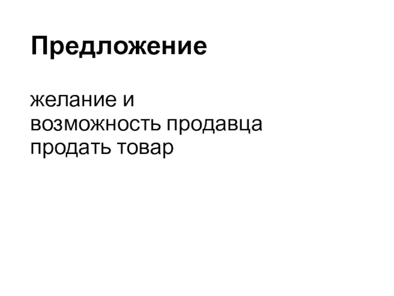 Закон предложения — при прочих неизменных факторах величина (объём) предложения увеличивается по мере увеличения цены на товар.