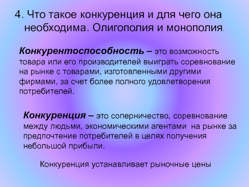 Конкуренция – это соперничество, соревнование между людьми, экономическими агентами на рынке за предпочтение потребителей в целях получения небольшой прибыли.