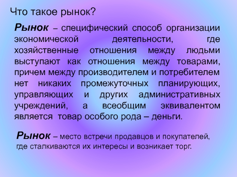 Рынок – место встречи продавцов и покупателей, где сталкиваются их интересы и возникает торг.