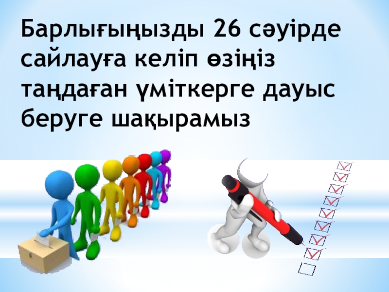Слайд 7Барлығыңызды 26 сәуірде сайлауға келіп өзіңіз таңдаған үміткерге дауыс беруге шақырамыз