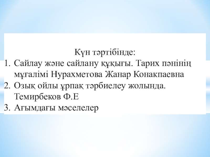 Күн тәртібінде:Сайлау және сайлану құқығы. Тарих пәнінің мұғалімі Нурахметова Жанар КонакпаевнаОзық ойлы ұрпақ тәрбиелеу жолында. Темирбеков Ф.ЕАғымдағы