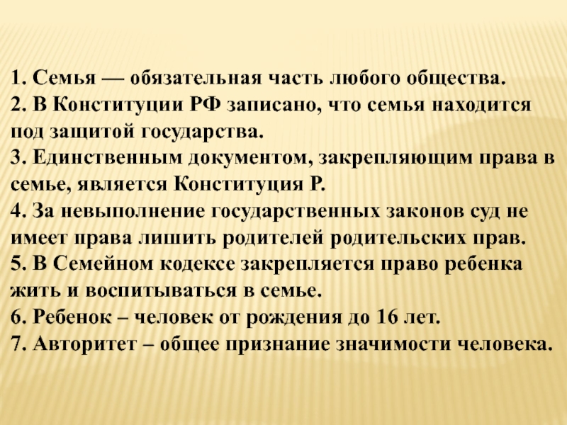 3. Единственным документом, закрепляющим права в семье, является Конституция Р.