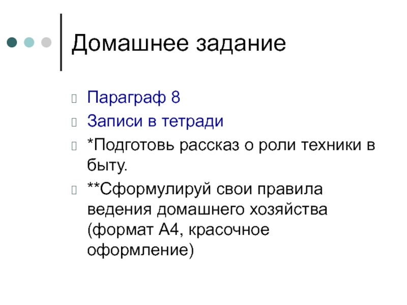 Домашнее заданиеПараграф 8Записи в тетради*Подготовь рассказ о роли техники в быту.**Сформулируй свои правила ведения домашнего хозяйства (формат