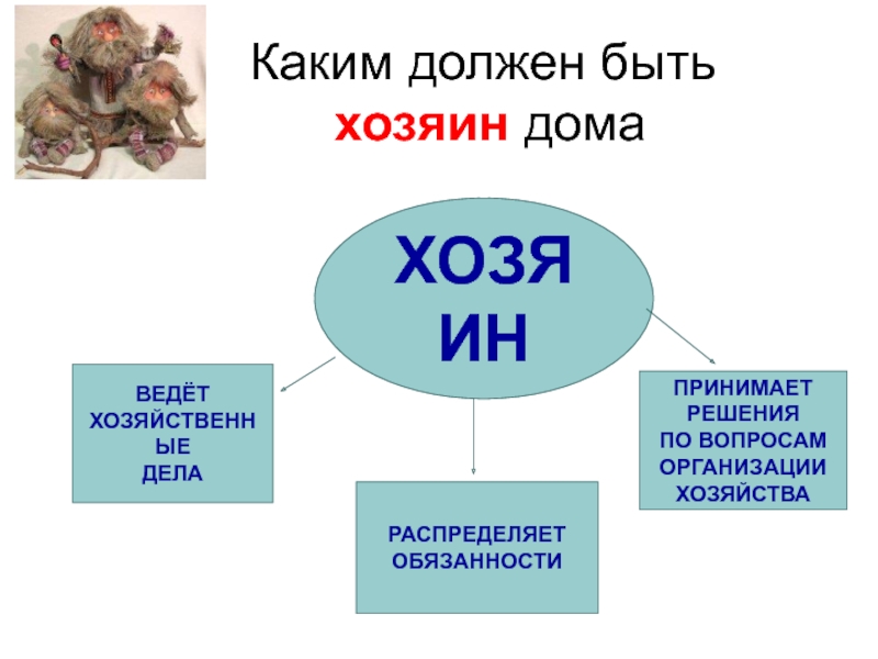 Каким должен быть  хозяин домаХОЗЯИНВЕДЁТ ХОЗЯЙСТВЕННЫЕДЕЛАРАСПРЕДЕЛЯЕТОБЯЗАННОСТИПРИНИМАЕТРЕШЕНИЯПО ВОПРОСАМОРГАНИЗАЦИИХОЗЯЙСТВА