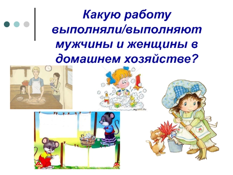Слайд 2Какую работу выполняли/выполняют мужчины и женщины в домашнем хозяйстве?