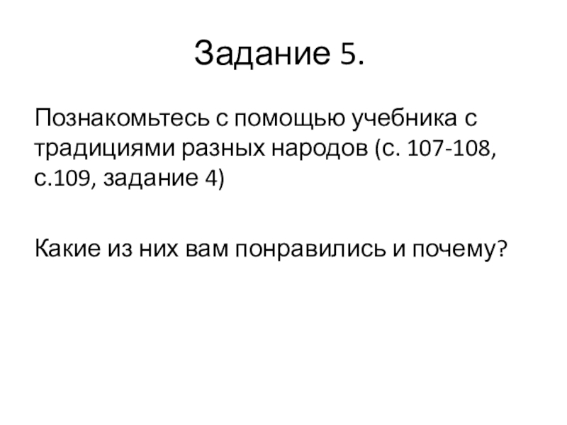 Задание 5.Познакомьтесь с помощью учебника с традициями разных народов (с. 107-108, с.109, задание 4)Какие из них вам