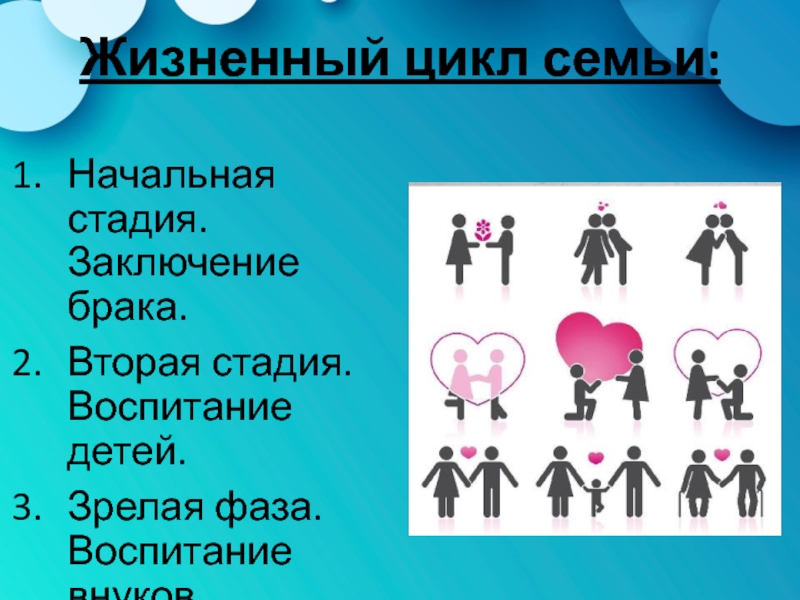 Жизненный цикл семьи:Начальная стадия. Заключение брака.Вторая стадия. Воспитание детей.Зрелая фаза. Воспитание внуков.Затухание.