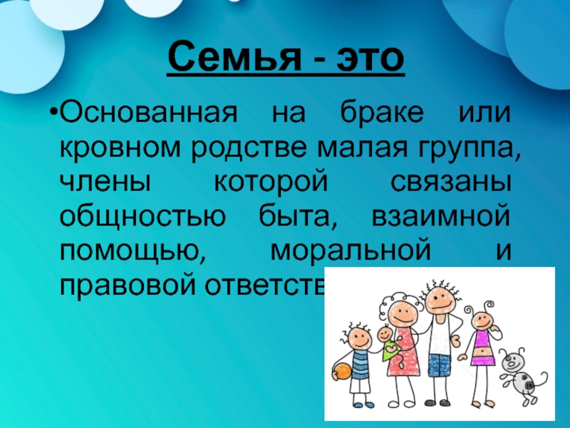 Семья - этоОснованная на браке или кровном родстве малая группа, члены которой связаны общностью быта, взаимной помощью,