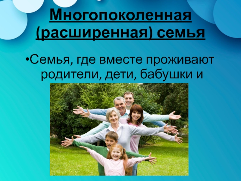 Многопоколенная (расширенная) семьяСемья, где вместе проживают родители, дети, бабушки и дедушки.