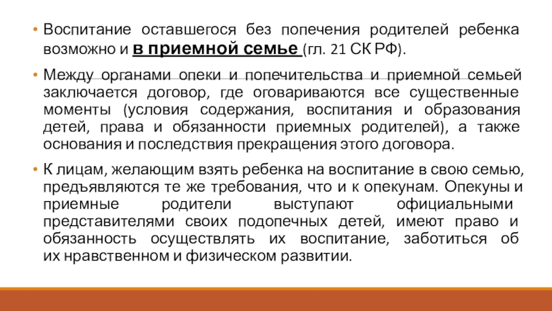 Слайд 25Воспитание оставшегося без попечения родителей ребенка возможно и в приемной семье (гл.