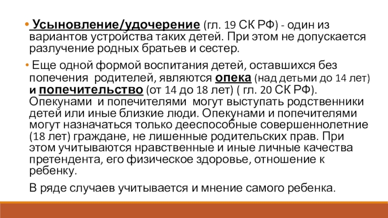 Слайд 24 Усыновление/удочерение (гл. 19 СК РФ) - один из вариантов устройства