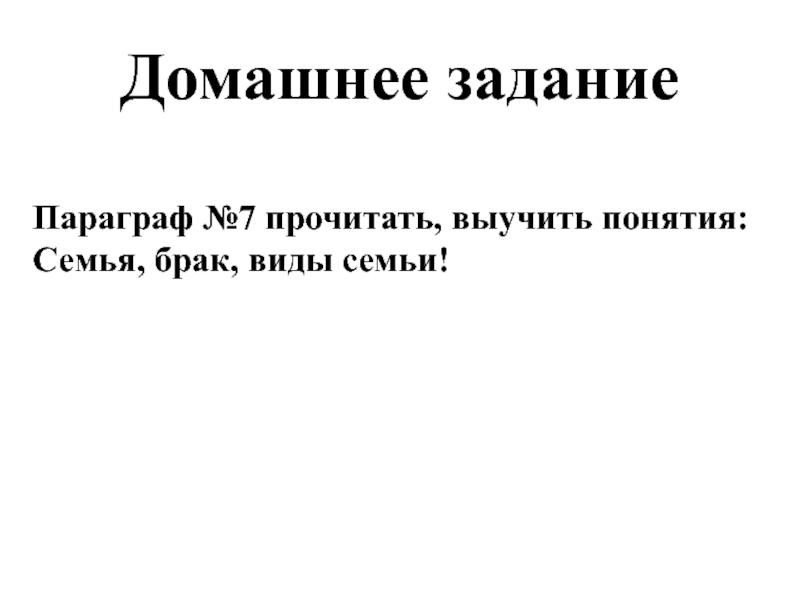 Домашнее заданиеПараграф №7 прочитать, выучить понятия:Семья, брак, виды семьи!