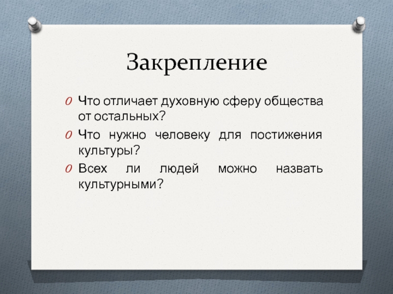 ЗакреплениеЧто отличает духовную сферу общества от остальных?Что нужно человеку для постижения культуры?Всех ли людей можно назвать культурными?