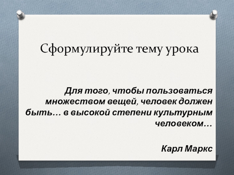 Сформулируйте тему урокаДля того, чтобы пользоваться множеством вещей, человек должен быть… в высокой степени культурным человеком… Карл Маркс