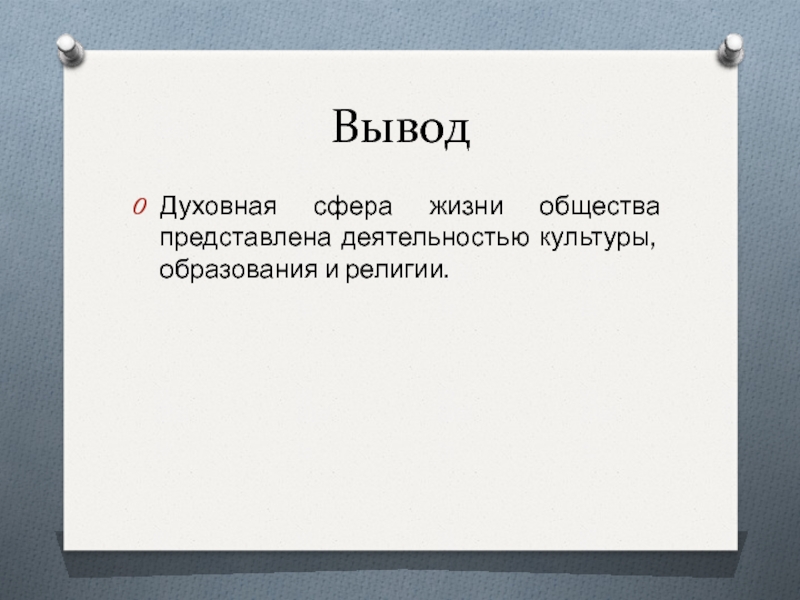ВыводДуховная сфера жизни общества представлена деятельностью культуры, образования и религии.