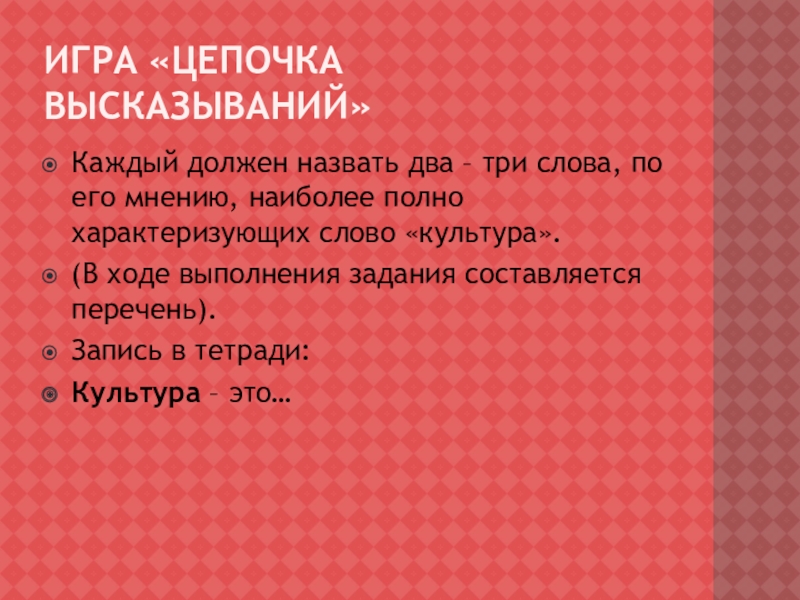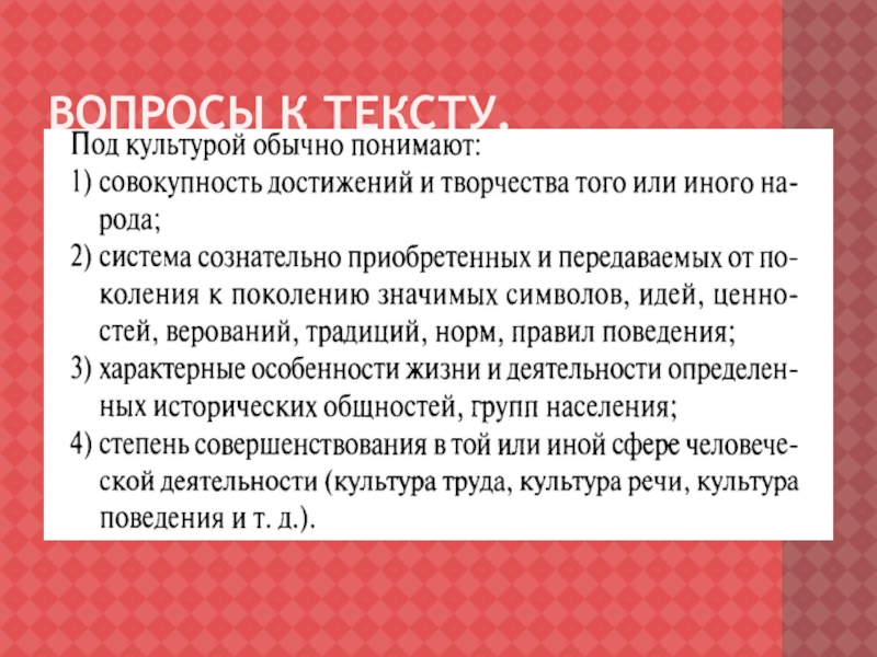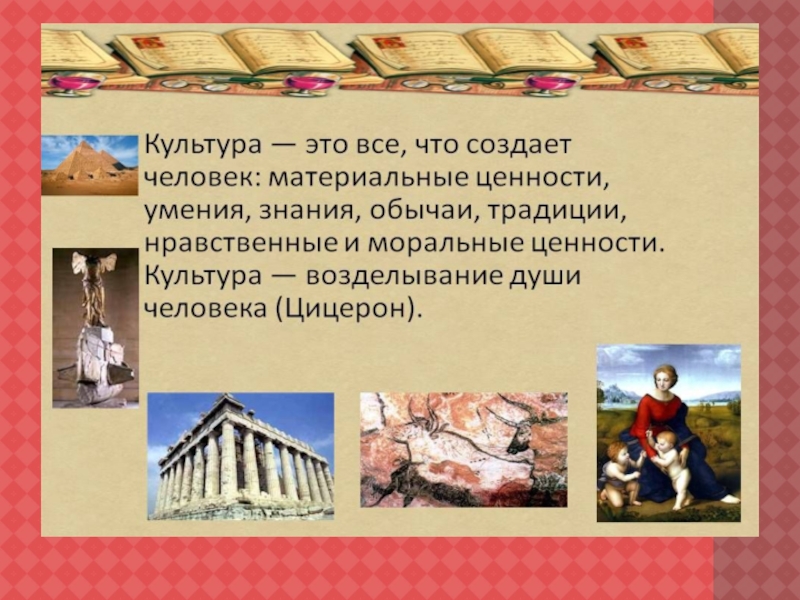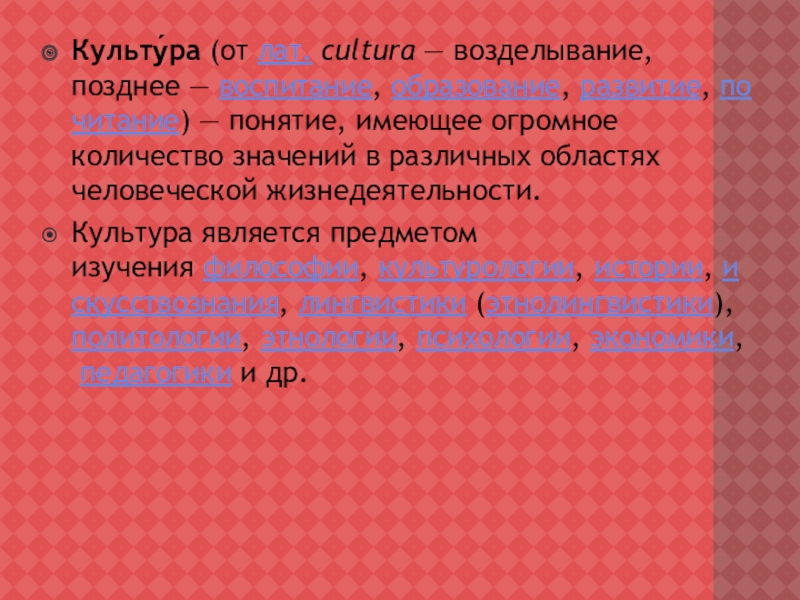 Слайд 3Культу́ра (от лат. cultura — возделывание, позднее — воспитание, образование, развитие, почитание) — понятие, имеющее огромное количество значений в различных областях