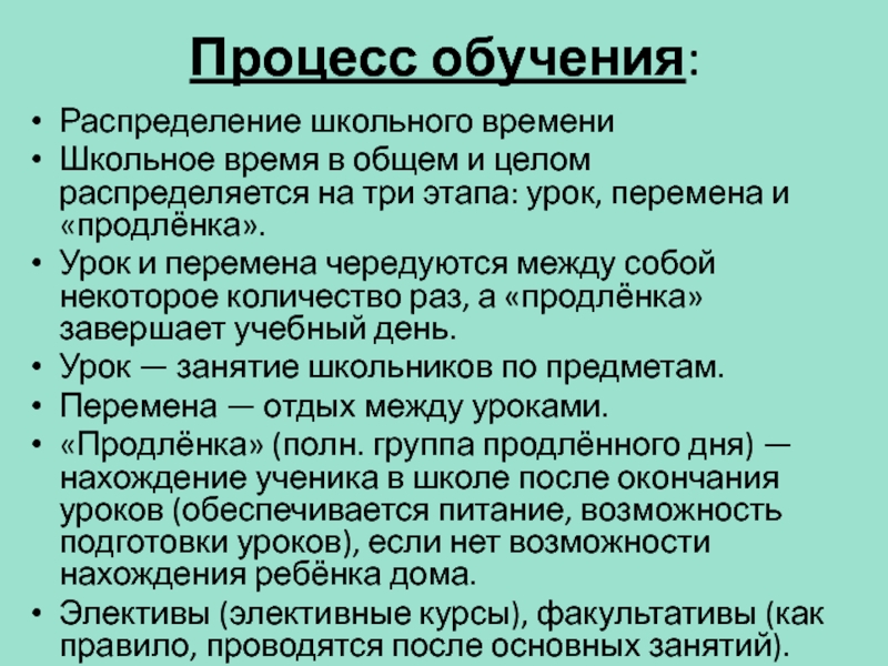 Процесс обучения:Распределение школьного времениШкольное время в общем и целом распределяется на три этапа: урок, перемена и «продлёнка».