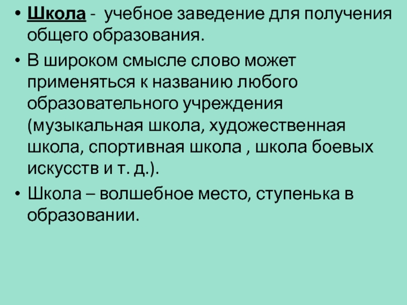 Слайд 7Школа - учебное заведение для получения общего образования.