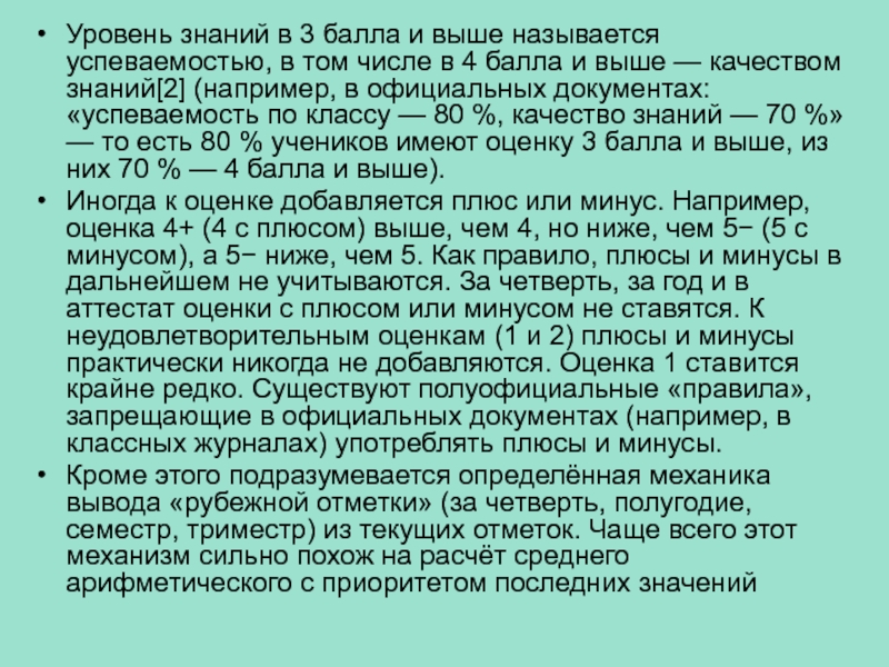 числе в 4 балла и выше — качеством знаний[2] (например, в официальных документах: «успеваемость по классу — 80 %, качество знаний — 70 %» — то есть 80 % учеников имеют оценку 3 балла и выше, из них 70 % — 4 балла и выше).