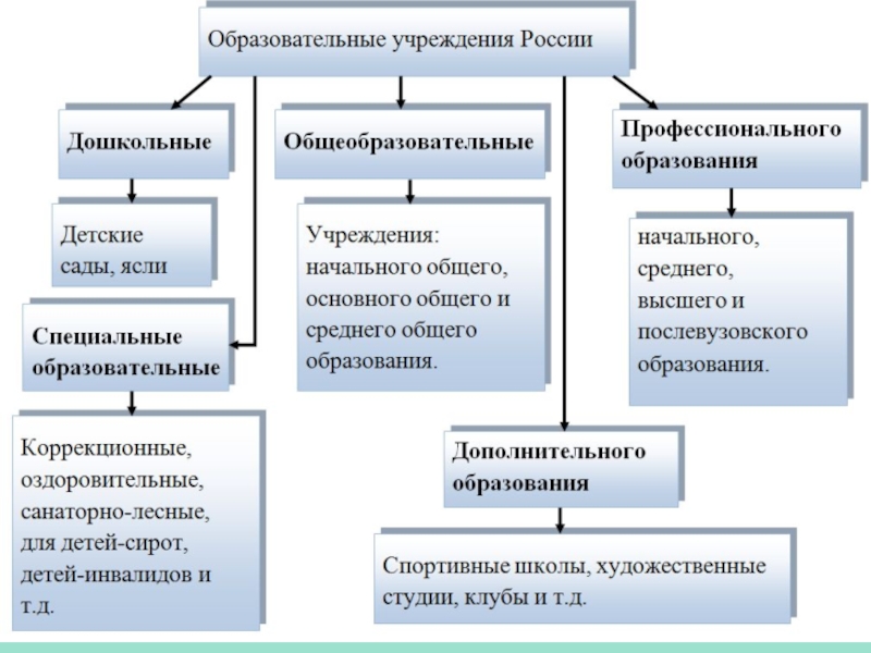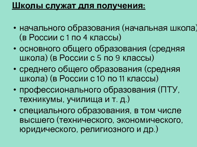 Школы служат для получения:начального образования (начальная школа) (в России с 1 по 4 классы)основного общего образования (средняя