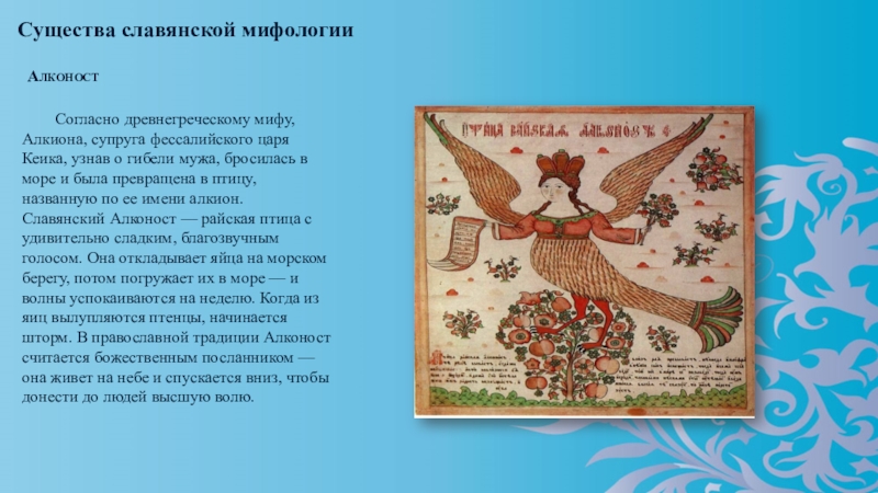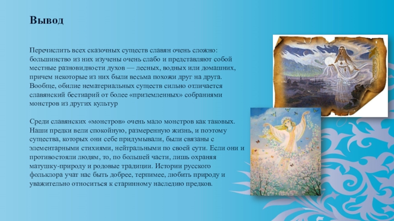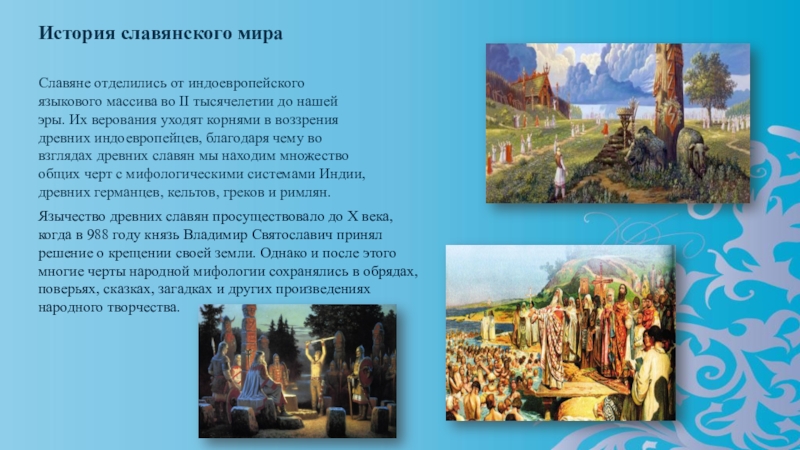 Язычество древних славян просуществовало до Х века, когда в 988 году князь Владимир Святославич принял решение о крещении своей земли. Однако и после этого многие черты народной мифологии сохранялись в обрядах, поверьях, сказках, загадках и других произведениях народного творчества.