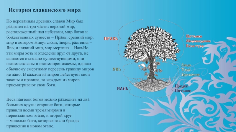 По верованиям древних славян Мир был разделен на три части: верхний мир, расположенный над небесами, мир богов и божественных существ – Правь; средний мир, мир в котором живут люди, звери, растения – Явь; и нижний мир, мир мертвых – НавьНо эти миры хоть и отделены друг от друга, не являются отдельно существующими, они взаимосвязаны и взаимопроникаемы, однако обычному смертному пересечь границу миров не дано. В каждом из миров действуют свои законы и правила, за каждым из миров присматривают свои боги.