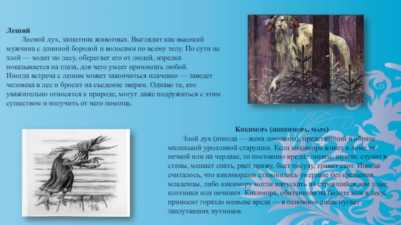 Злой дух (иногда — жена домового), предстающий в образе маленькой уродливой старушки. Если кикимора живет в доме за печкой или на чердаке, то постоянно вредит людям: шумит, стучит в стены, мешает спать, рвет пряжу, бьет посуду, травит скот. Иногда считалось, что кикиморами становились умершие без крещения младенцы, либо кикимору могли напускать на строящийся дом злые плотники или печники. Кикимора, обитающая на болоте или в лесу, приносит гораздо меньше вреда — в основном лишь пугает заплутавших путников.