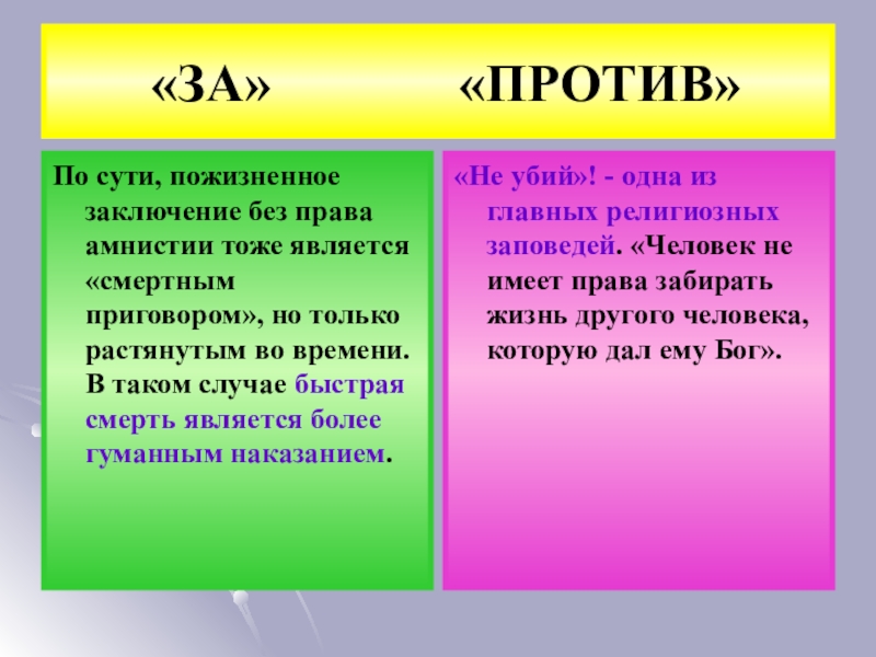 «Не убий»! - одна из главных религиозных заповедей. «Человек не имеет права забирать жизнь другого человека, которую дал ему Бог».