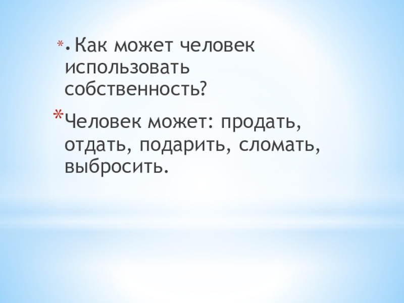 •	Как может человек использовать собственность?Человек может: продать, отдать, подарить, сломать, выбросить.