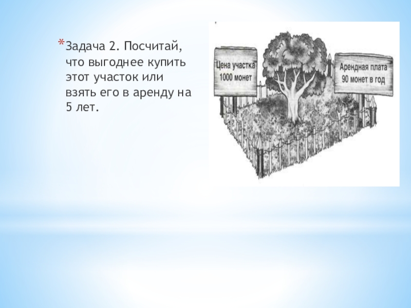 Слайд 12Задача 2. Посчитай, что выгоднее купить этот участок или взять его