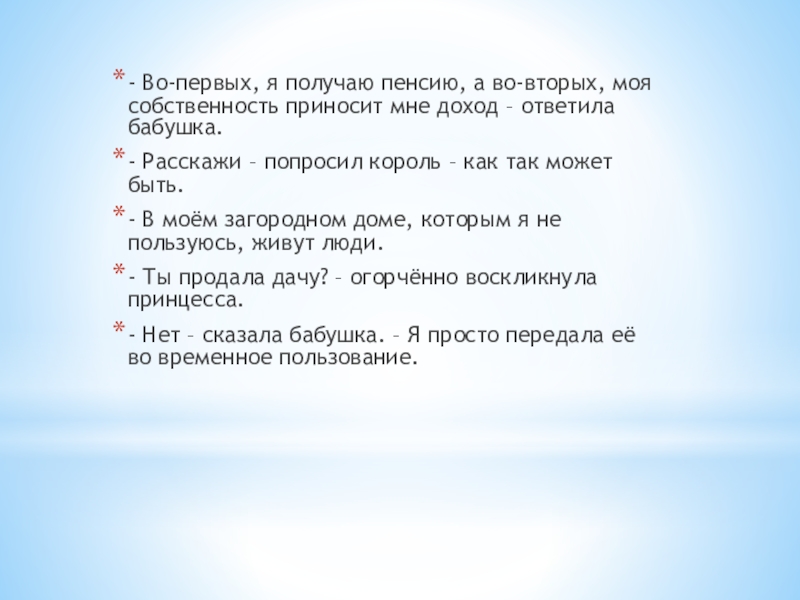 - Во-первых, я получаю пенсию, а во-вторых, моя собственность приносит мне доход – ответила бабушка.- Расскажи –