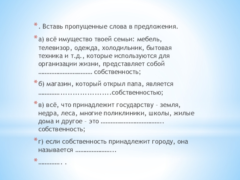 . Вставь пропущенные слова в предложения.а) всё имущество твоей семьи: мебель, телевизор, одежда, холодильник, бытовая техника и
