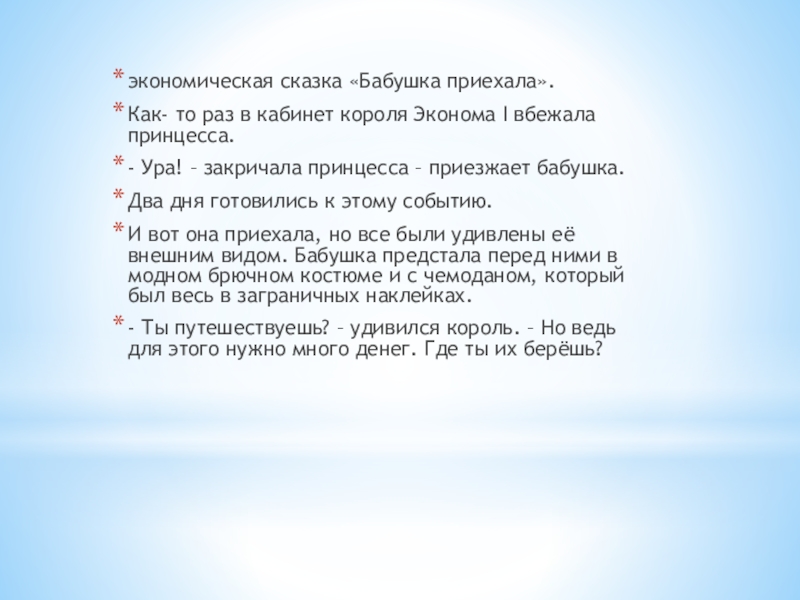 экономическая сказка «Бабушка приехала».Как- то раз в кабинет короля Эконома I вбежала принцесса.- Ура! – закричала принцесса