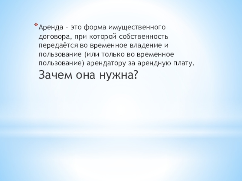 временное владение и пользование (или только во временное пользование) арендатору за арендную плату. Зачем она нужна?