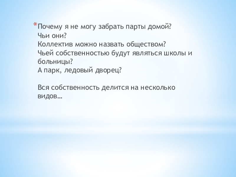 Почему я не могу забрать парты домой? Чьи они? Коллектив можно назвать обществом? Чьей собственностью будут являться школы и больницы? А парк, ледовый дворец? Вся собственность делится на несколько видов…