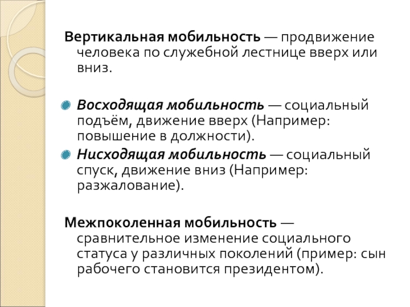Межпоколенная мобильность — сравнительное изменение социального статуса у различных поколений (пример: сын рабочего становится президентом).