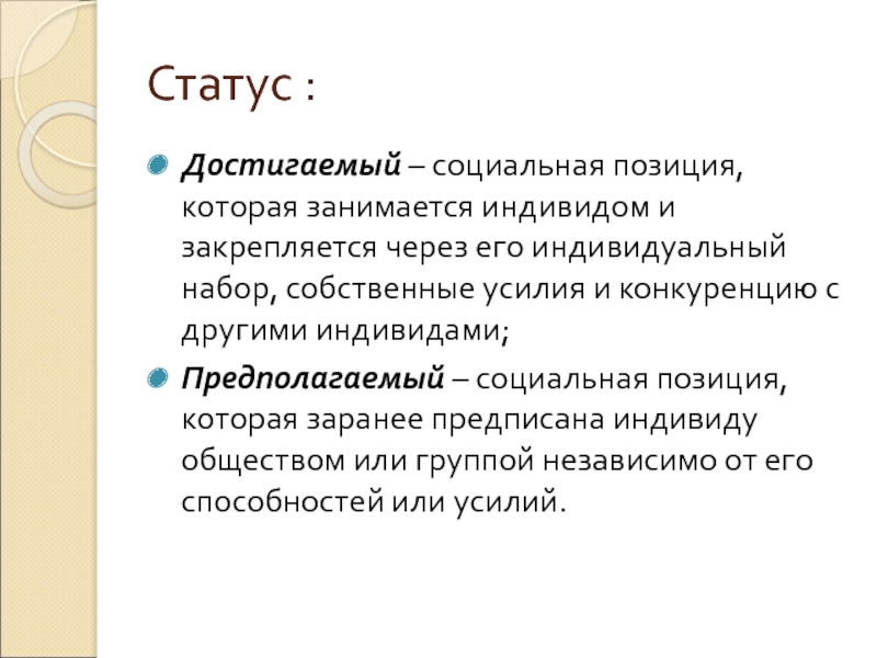 Предполагаемый – социальная позиция, которая заранее предписана индивиду обществом или группой независимо от его способностей или усилий.