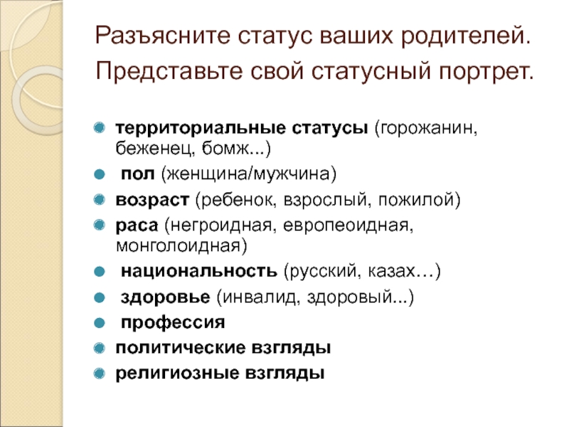 Слайд 11Разъясните статус ваших родителей. Представьте свой статусный портрет.