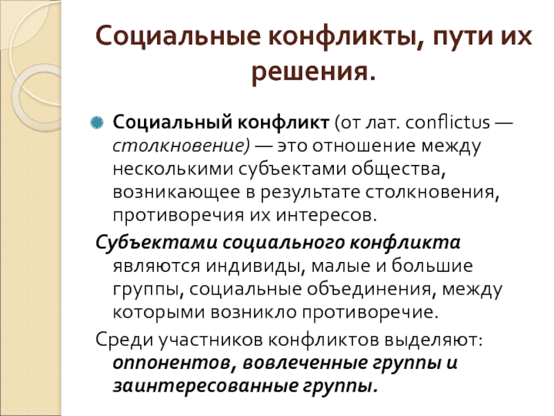 Субъектами социального конфликта являются индивиды, малые и большие группы, социальные объединения, между которыми возникло противоречие.