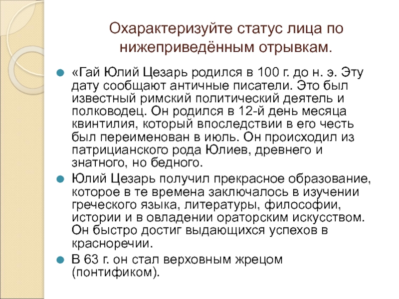Слайд 12Охарактеризуйте статус лица по нижеприведённым отрывкам.