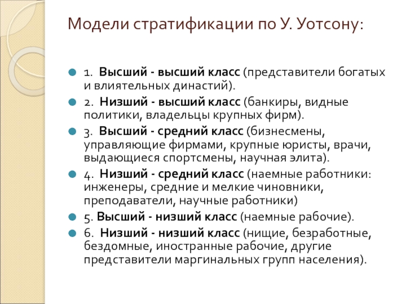6. Низший - низший класс (нищие, безработные, бездомные, иностранные рабочие, другие представители маргинальных групп населения).
