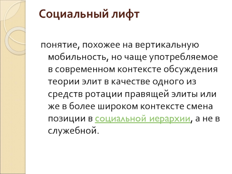 контексте обсуждения теории элит в качестве одного из средств ротации правящей элиты или же в более широком контексте смена позиции в социальной иерархии, а не в служебной.