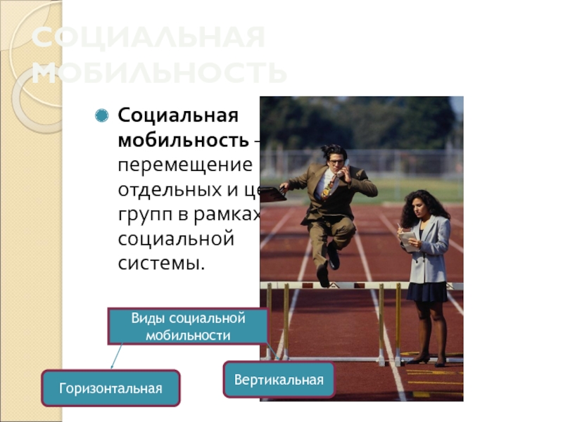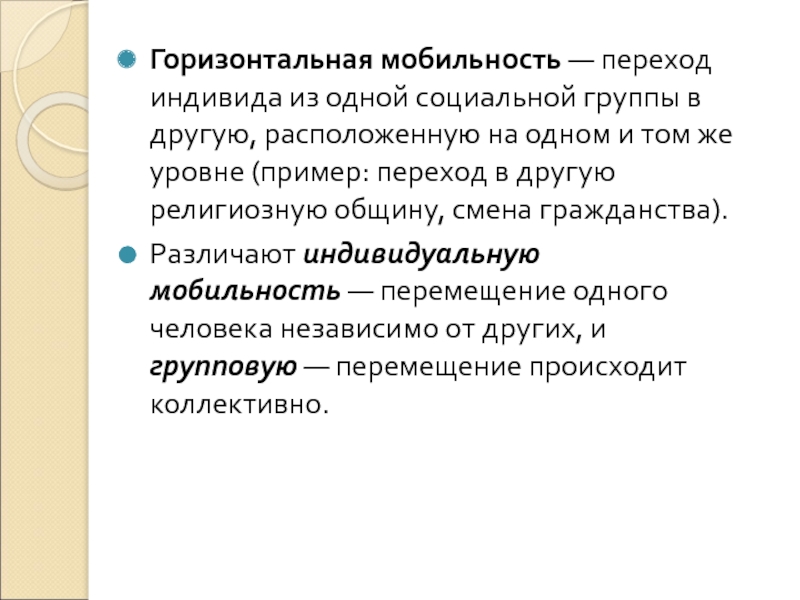 Слайд 17Горизонтальная мобильность — переход индивида из одной социальной группы в другую, расположенную