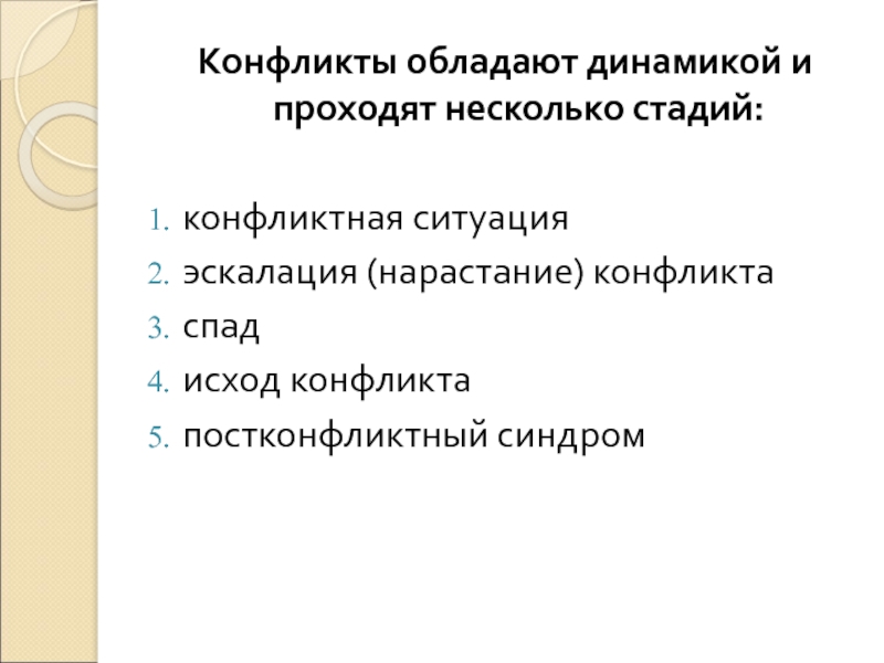 Слайд 22Конфликты обладают динамикой и проходят несколько стадий: