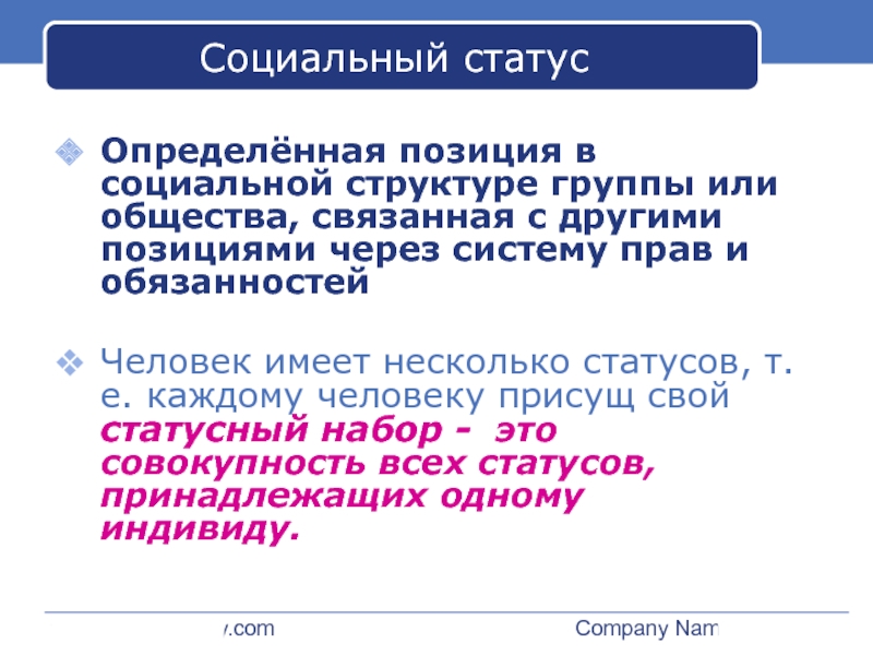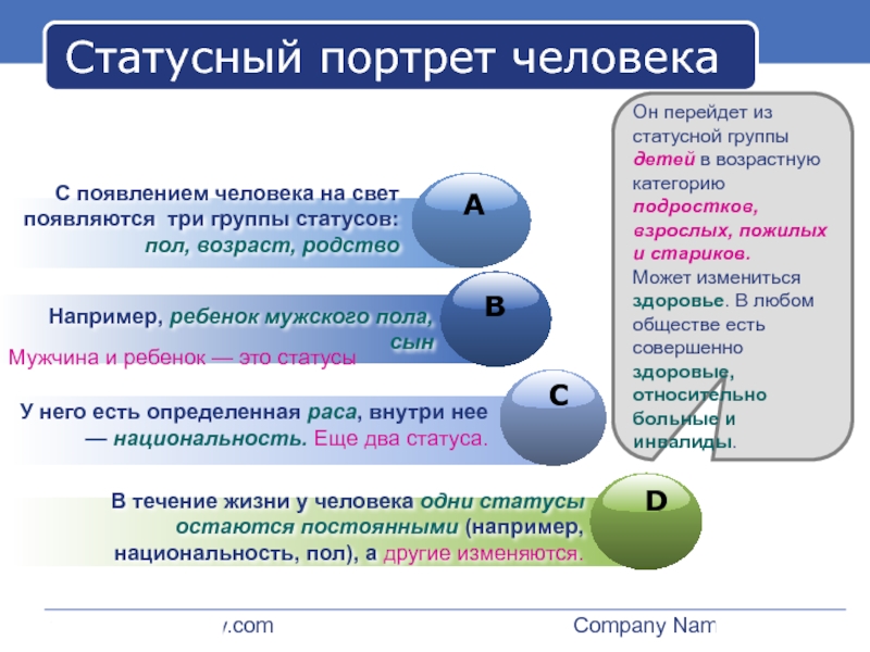 В течение жизни у человека одни статусы остаются постоянными (например, национальность, пол), а другие изменяются.