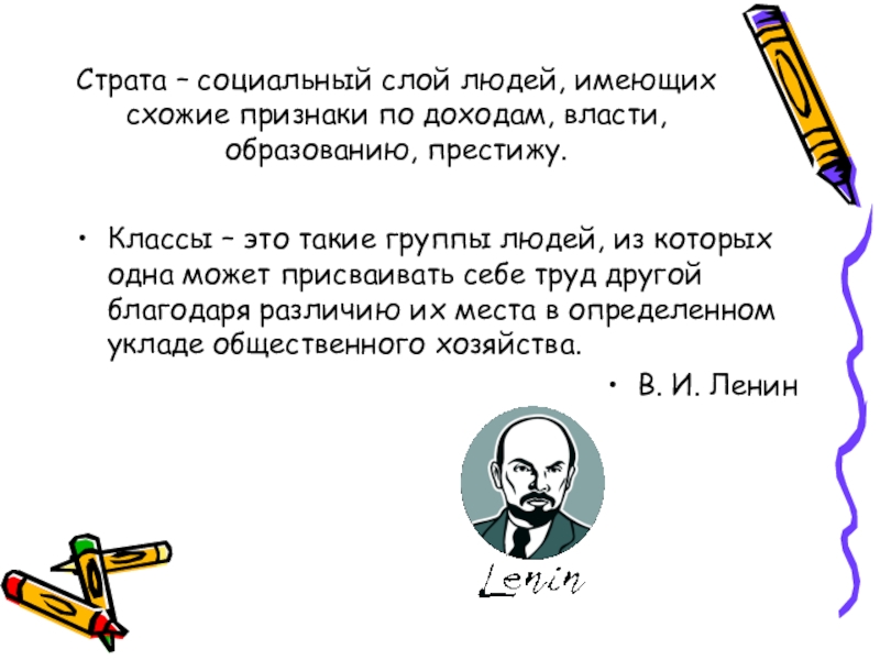 Классы – это такие группы людей, из которых одна может присваивать себе труд другой благодаря различию их места в определенном укладе общественного хозяйства.