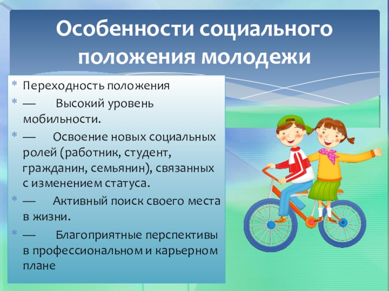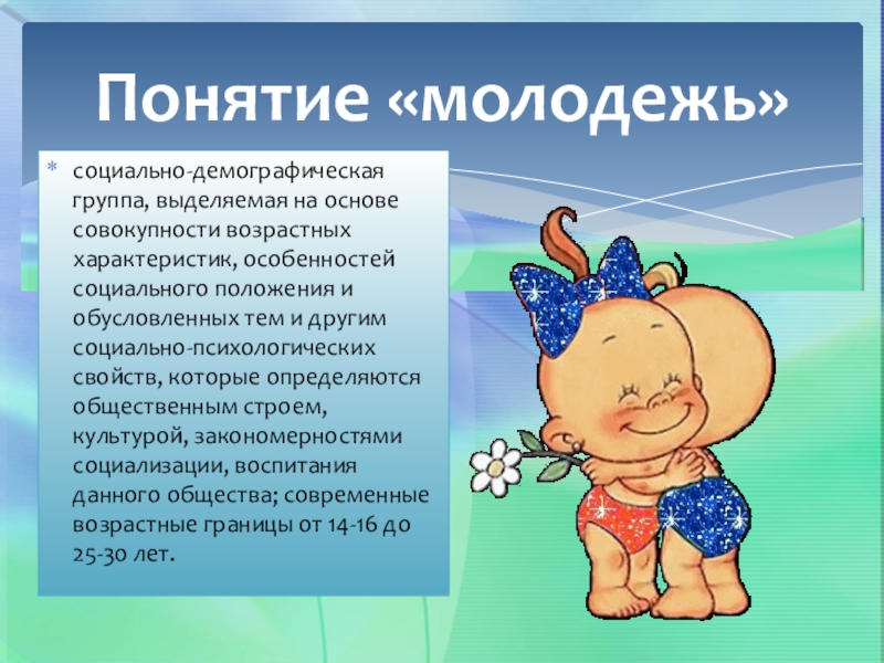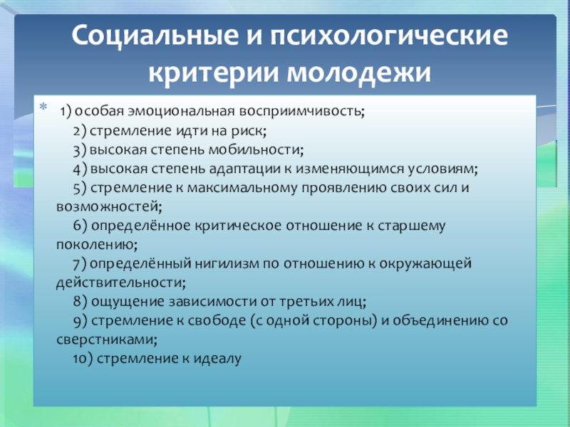 положения и обусловленных тем и другим социально-психологических свойств, которые определяются общественным строем, культурой, закономерностями социализации, воспитания данного общества; современные возрастные границы от 14-16 до 25-30 лет.
