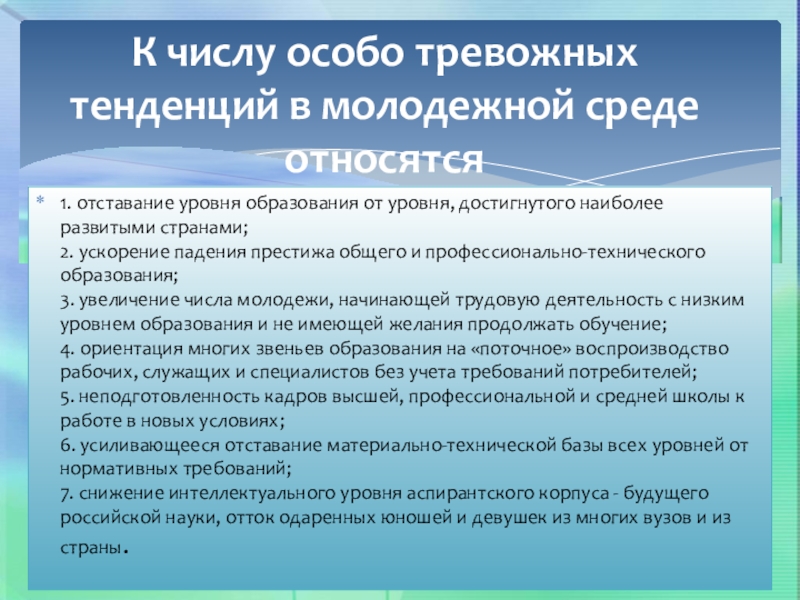 3. увеличение числа молодежи, начинающей трудовую деятельность с низким уровнем образования и не имеющей желания продолжать обучение;